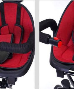 Khung xe làm bằng hợp kim sơn tĩnh điện chắc chắn và sang trọng, khoang chỗ ngồi rộng và thành tựa cao giúp bé ngồi thoải mái, chắc chắn, hệ thống đai dây an toàn bảo vệ bé tối ưu, tránh cho bé bị ngã khi di chuyển